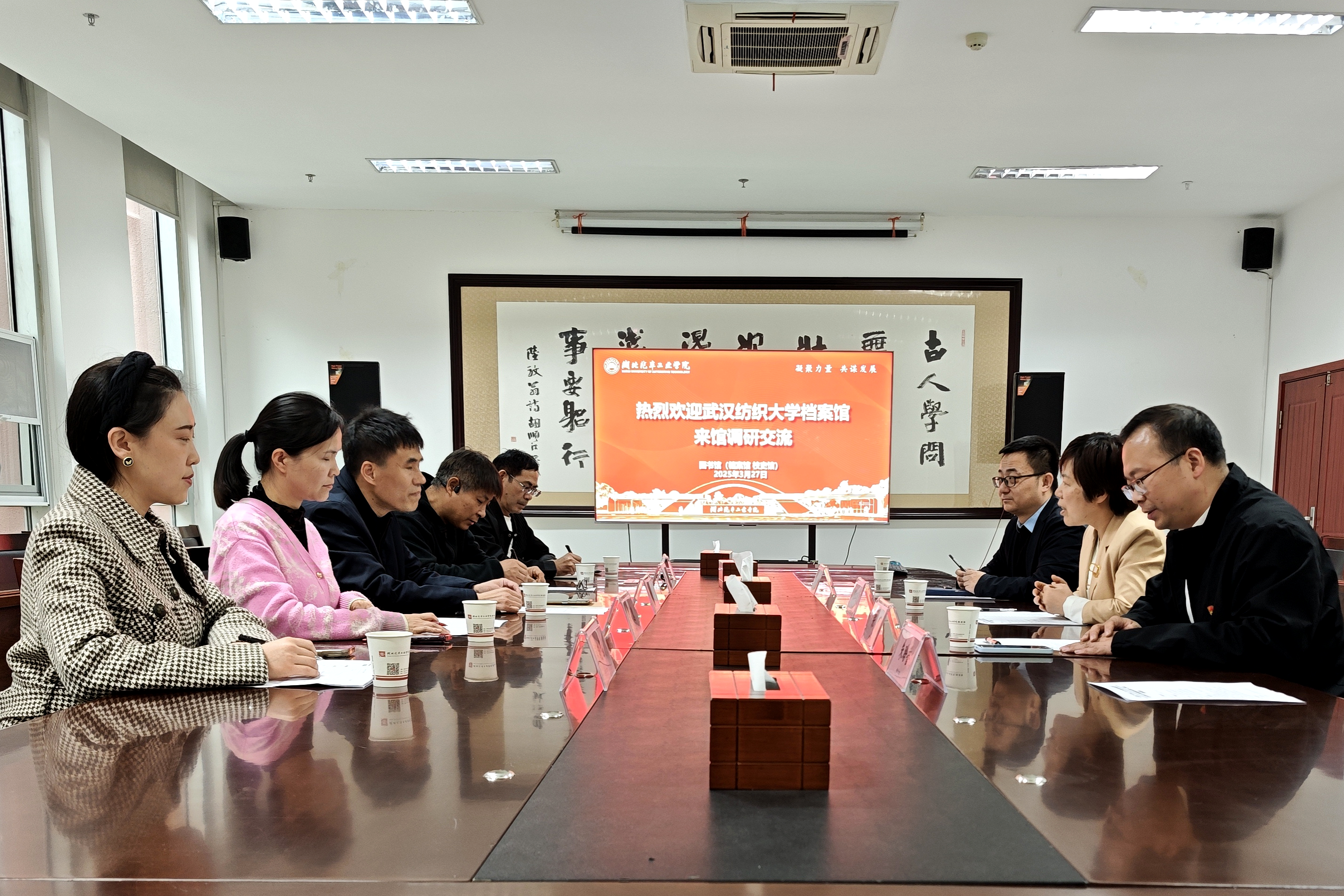 随后的座谈会上,张红霞回顾了两校长期以来的合作历程。她指出,武汉纺织大学在学科建设、研究生培养等方面积累的丰富经验,为我校推进“三步走”发展战略提供了有力支撑。张红霞期待双方以此次调研为契机,进一步深化档案管理领域的资源共享与协同创新,实现优势互补、共同进步。